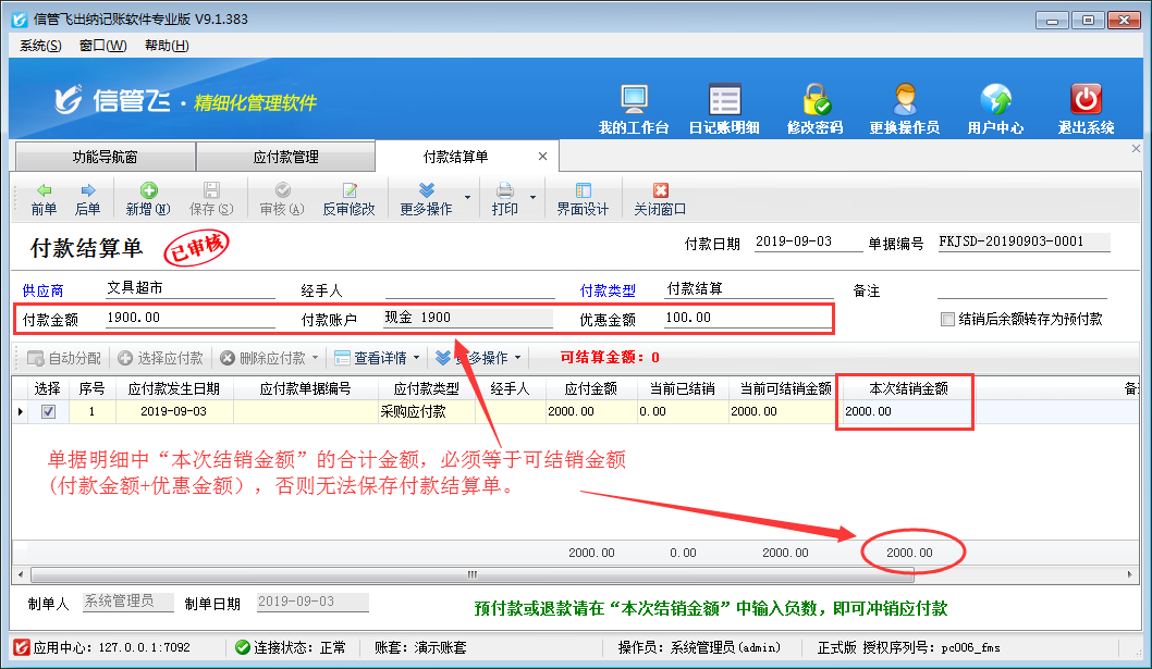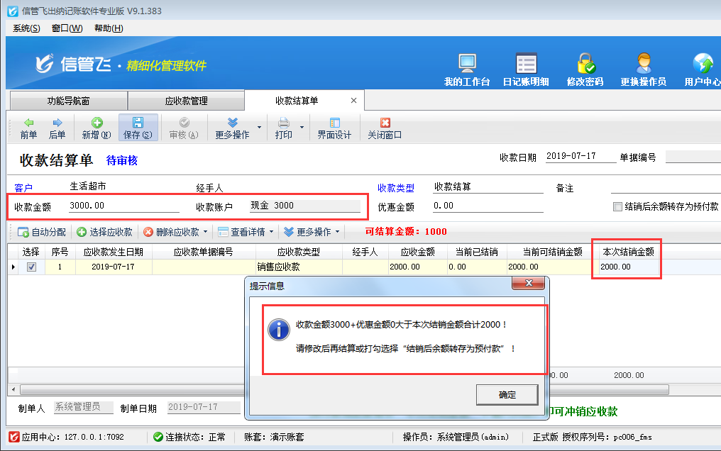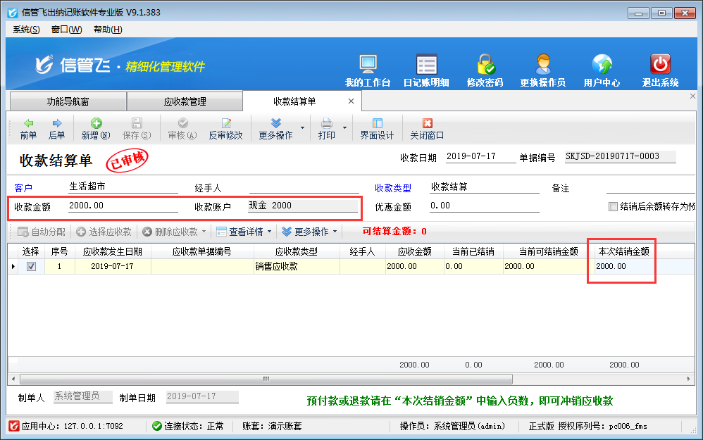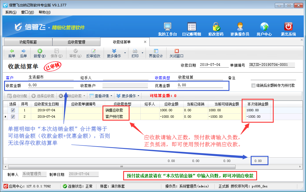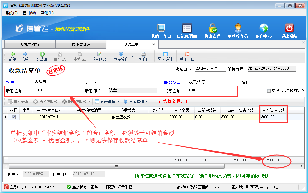 ????注意:收款結(jié)算單單據(jù)明細(xì)中“本次結(jié)銷金額”的合計(jì)金額,必須等于可結(jié)銷金額(收款金額 + 優(yōu)惠金額),否則無法保存收款結(jié)算單。