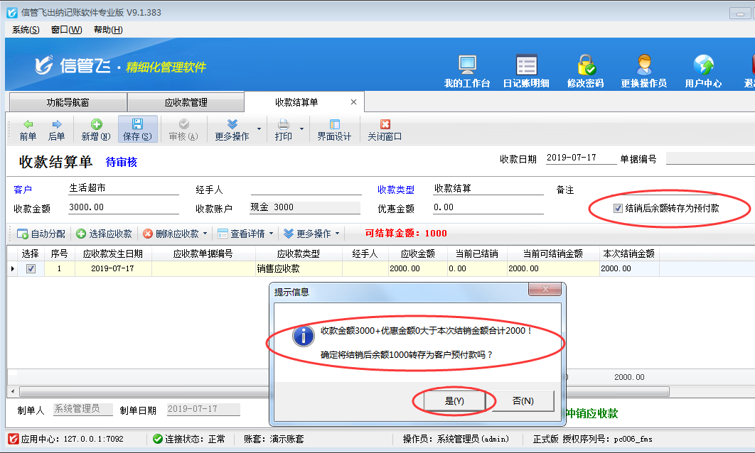 ????此種情況下如確認(rèn)沒有填寫錯(cuò)誤,確定是多收的預(yù)付款,可以打勾選擇“結(jié)銷余額轉(zhuǎn)為預(yù)付款”復(fù)選框,軟件會(huì)自動(dòng)生成相應(yīng)的收款結(jié)算單(其收款類型為“客戶預(yù)付款”,如此例中預(yù)付金額為1000元)。如下圖所示。勾選“結(jié)銷后余額轉(zhuǎn)存為預(yù)付款”后,保存時(shí),系統(tǒng)會(huì)提示“收款金額2000+優(yōu)惠金額0大于本次結(jié)銷金額合計(jì)2000!確定將結(jié)銷后余額1000轉(zhuǎn)存為客戶預(yù)付款嗎?”點(diǎn)擊“是”確定轉(zhuǎn)存并審核收款結(jié)算單即可。