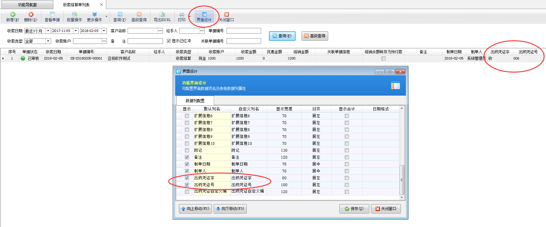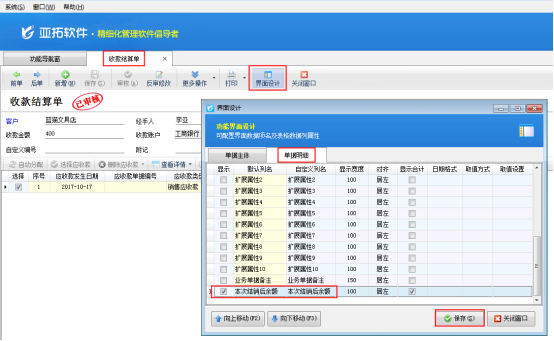 ????界面設(shè)計(jì)設(shè)置后,可以看到收款結(jié)算單界面的單據(jù)明細(xì)中已經(jīng)顯示了“本次結(jié)銷后余額”數(shù)據(jù)項(xiàng),用戶可以看到該條應(yīng)收款的本次結(jié)銷后的余額。