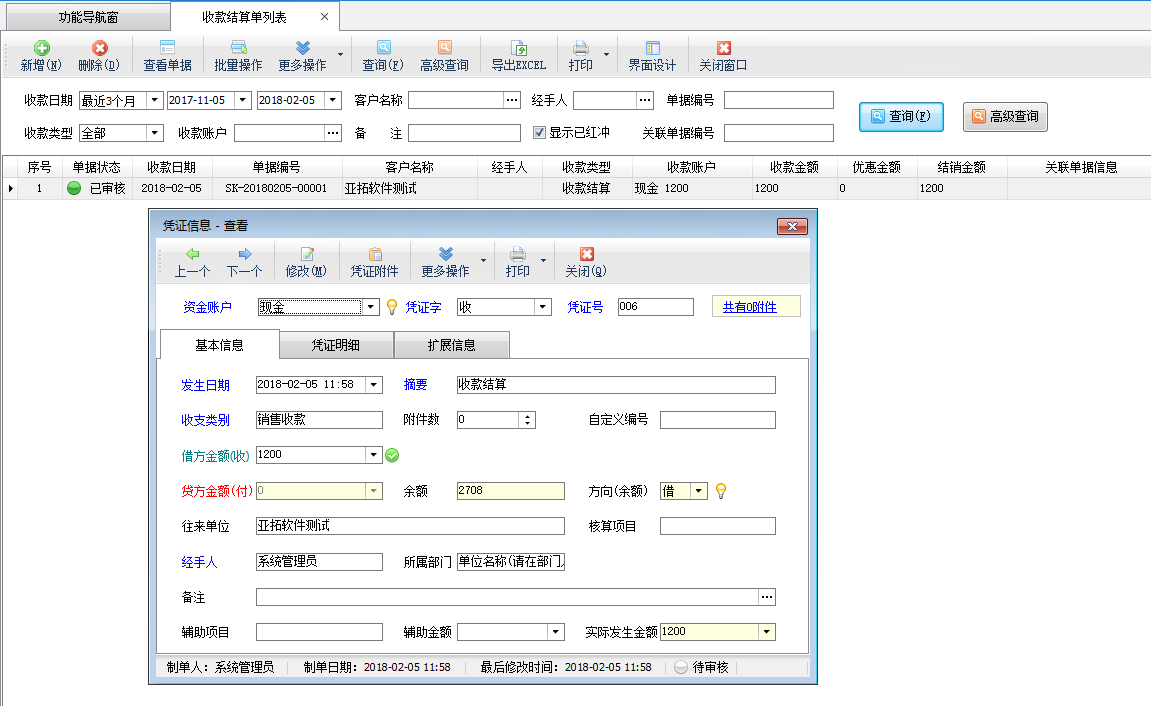 ????在功能導(dǎo)航窗點(diǎn)擊“往來管理”—》“應(yīng)收款管理”可以查看到當(dāng)前未結(jié)銷的應(yīng)收款,選擇示例客戶“亞拓軟件測(cè)試”點(diǎn)擊工具欄的“收款結(jié)算”按鈕,會(huì)進(jìn)入收款結(jié)算單界面,如下圖1所示: