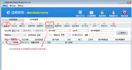 ????保存后,應(yīng)收款管理界面增加一條未結(jié)銷的銷售應(yīng)收款記錄,后續(xù)客戶付款后,可以在軟件中結(jié)銷此銷售應(yīng)收款,選擇此銷售應(yīng)收款記錄,然后在工具欄點(diǎn)擊“收款結(jié)算”按鈕即可對(duì)銷售應(yīng)收款進(jìn)行收款結(jié)銷,如下圖所示: