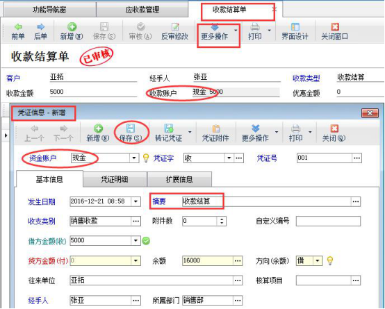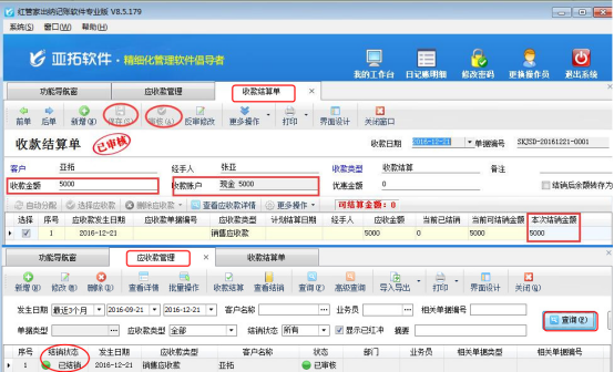 ????選擇示例客戶“亞拓軟件”,應(yīng)收款為15980元,本次收款5000元,選擇應(yīng)收款單據(jù)點(diǎn)擊“收款結(jié)算”,彈出的收款結(jié)算單界面,收款金額輸入5000,點(diǎn)擊“自動(dòng)分配”分配到本次結(jié)銷金額中(如沒有默認(rèn)資金賬戶,選擇收款賬戶輸入收款金額),然后保存并審核收款結(jié)算單,則表示此筆應(yīng)收款結(jié)銷5000元,如下圖所示:
