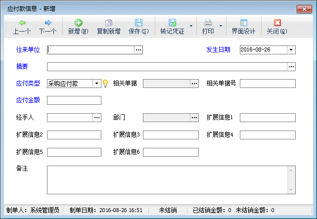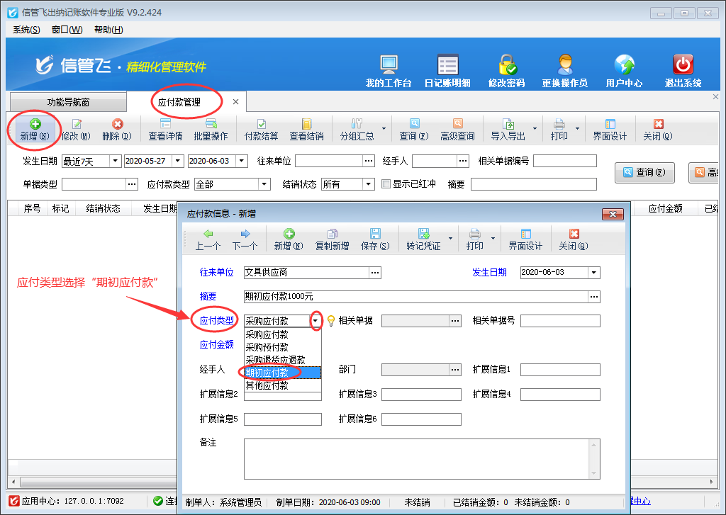 ????在功能導(dǎo)航窗點(diǎn)擊“往來管理”—》“應(yīng)付款管理”,即可打開應(yīng)付款管理界面,在工具欄點(diǎn)擊“新增”按鈕,系統(tǒng)打開新增應(yīng)付款窗口,如下圖所示,“應(yīng)付類型”選擇為“期初應(yīng)付款”,然后錄入應(yīng)付金額及其他數(shù)據(jù)后保存此應(yīng)付款信息即可。