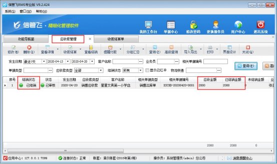 ????收款結(jié)算單單據(jù)保存并審核之后,更新應(yīng)收款的結(jié)銷狀態(tài),在應(yīng)收款管理界面可以查看應(yīng)收款結(jié)銷情況,如下圖所示,客戶“星星文具第一小學(xué)店”應(yīng)收金額2000元已結(jié)銷,未結(jié)銷金額為0。