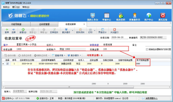 ????如果需要給客戶優(yōu)惠或抹零,可以錄入優(yōu)惠金額,如應(yīng)收2000元,實(shí)際收款1900元,優(yōu)惠了100元,請(qǐng)?jiān)谑湛罱Y(jié)算單單據(jù)主體“收款金額”中錄入1900元,“優(yōu)惠金額”內(nèi)錄入100元,單據(jù)明細(xì)中“本次結(jié)銷金額”錄入2000元,保存并審核收款結(jié)算單即可,如下圖所示。