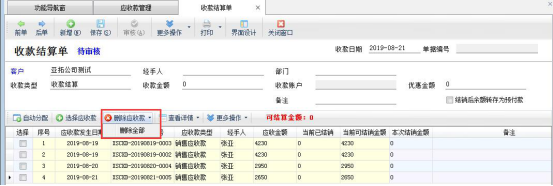 ????彈出“收款結(jié)算單”界面,默認(rèn)是顯示所有的未結(jié)銷的應(yīng)收款,如需要只結(jié)銷部分應(yīng)收款(示例結(jié)銷2019-8-19的應(yīng)收款),有以下兩種方法: