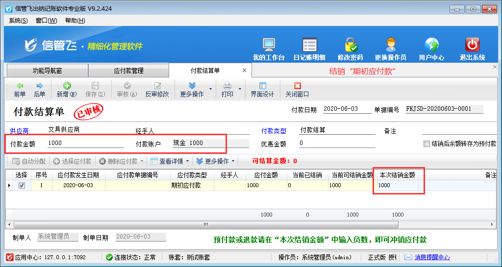 ????保存后,應(yīng)付款管理界面增加一條未結(jié)銷的期初應(yīng)付款記錄,后續(xù)給供應(yīng)商結(jié)款后,可以在軟件中結(jié)銷此期初應(yīng)付款,選擇此條期初應(yīng)付款記錄,然后在工具欄點(diǎn)擊“付款結(jié)算”按鈕即可打開付款結(jié)算單界面對(duì)期初應(yīng)付款進(jìn)行付款結(jié)銷,如下圖所示: