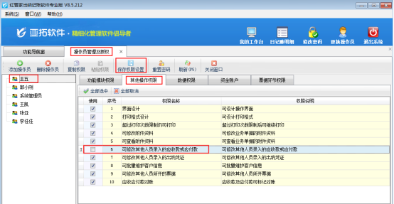 ????在功能導(dǎo)航窗點(diǎn)“系統(tǒng)管理”→“操作員及授權(quán)”即可進(jìn)入“操作員管理及授權(quán)”界面,選中操作員賬號(hào),在“其他操作權(quán)限”界面將“可修改其他人員錄入的應(yīng)收款或應(yīng)付款”權(quán)限打鉤取消,如下圖1所示,設(shè)置操作員賬號(hào)“王五”不可修改其他人員錄入的應(yīng)收款或應(yīng)付款。
