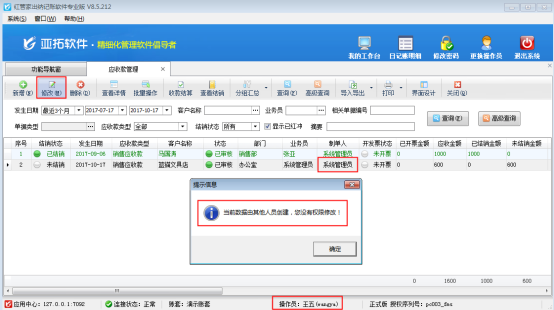 ????設(shè)置完成之后,我們使用操作員“王五”登錄軟件并修改其他人員所錄入的應(yīng)收款信息時(shí),可以看到系統(tǒng)會(huì)彈出提示信息“當(dāng)前數(shù)據(jù)由其他人員創(chuàng)建,您沒有權(quán)限修改!”,如下圖2所示。