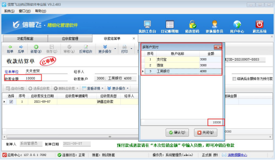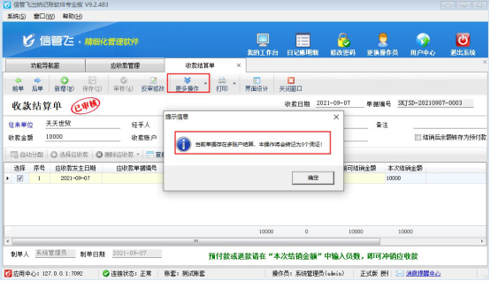 ????收款金額中輸入收款金額,自動(dòng)分配金額至本次結(jié)銷金額中,勾選“結(jié)銷后余額轉(zhuǎn)存為預(yù)付款”,可以保存成功。