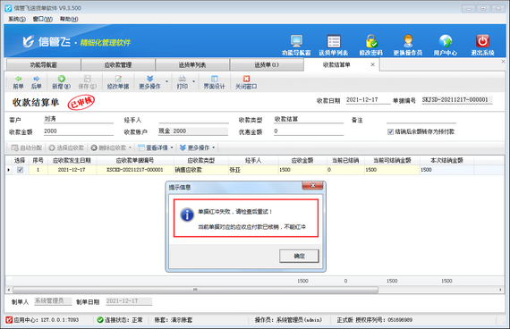 ????應(yīng)收、應(yīng)付賬款管理是現(xiàn)代企業(yè)資金管理的重要組成部分,其管理效果的好壞直接影響到企業(yè)經(jīng)營(yíng)的成敗,信管飛RMS、信管飛出納記賬軟件及信管飛送貨單軟件均支持管理往來賬款,如果應(yīng)收款結(jié)銷后發(fā)現(xiàn)收款結(jié)銷錯(cuò)誤,系統(tǒng)支持紅沖并刪除收款記錄,部分用戶在紅沖收款結(jié)算單時(shí)會(huì)出現(xiàn)如下圖提示:收款結(jié)算單紅沖失敗,當(dāng)前單據(jù)對(duì)應(yīng)的應(yīng)收應(yīng)付款已結(jié)銷,不能紅沖!