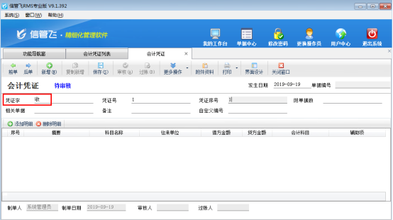 ????再次新增會計憑證時,就會自動顯示設置的默認憑證字,如下圖所示: