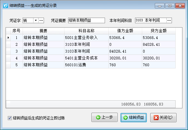 ????點擊“下一步”按鈕,軟件會自動生成相應的憑證分錄,點“結轉損益”按鈕即可結轉余額到“本年利潤”科目。可以打勾選擇“結轉損益后生成的憑證立即過賬”復選框,則相應的憑證會自動審核過帳。