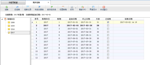 ????結賬:在工具欄中點擊“結賬”按鈕,可以對當前賬期進行結賬。