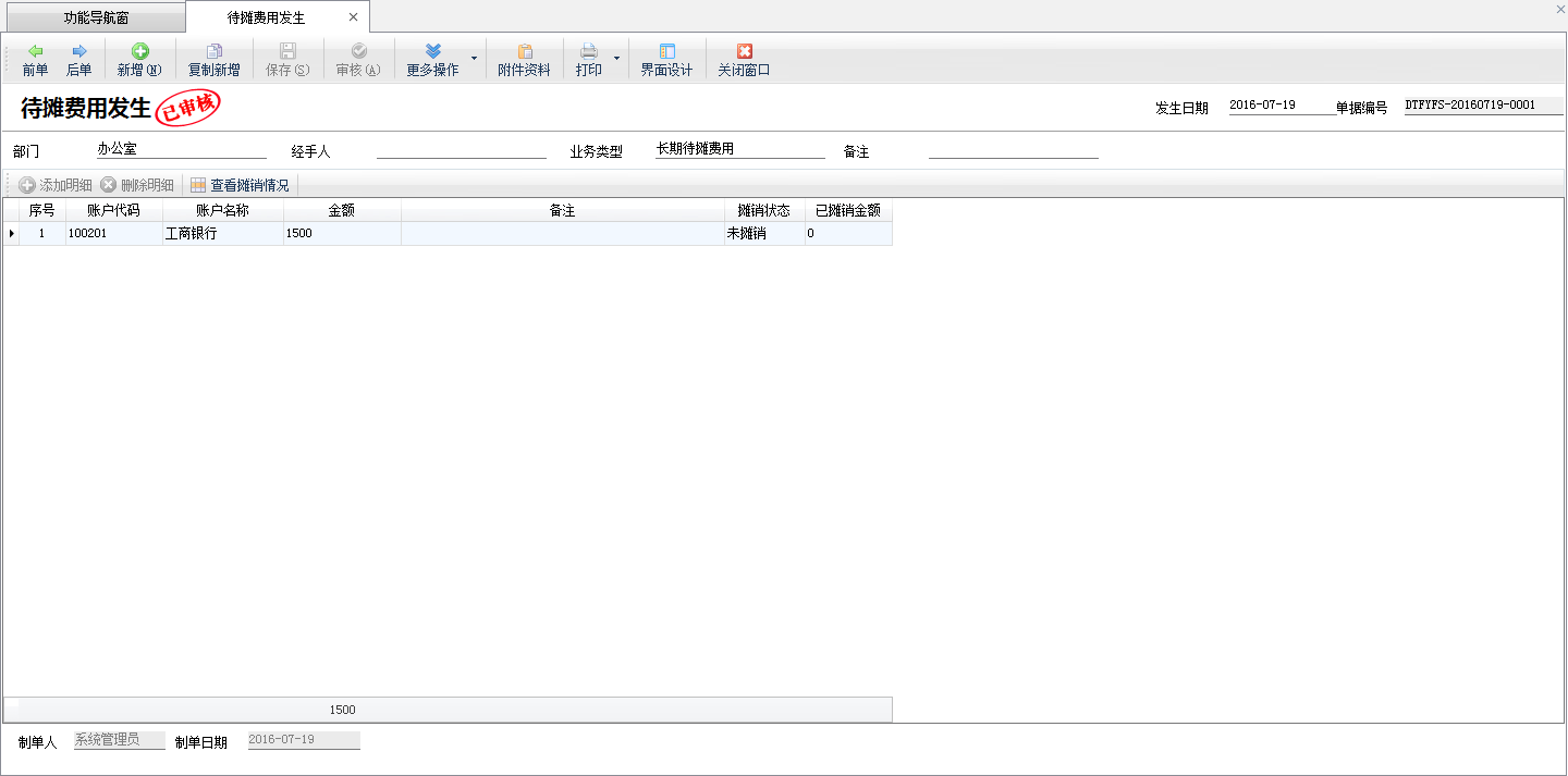 ????亞拓管理軟件專業版及以上版本內含有財務處理功能模塊,可以管理待攤費用及對待攤費用進行攤銷,待攤費用用于處理需要多個賬期分攤的成本費用,如付房租,一次要付以后幾個月份的租金,但每月只應負擔當月的租金費用。實際業務中還有些費用逐步發生,但實際我們需要過幾個月后才支付。如銀行借款的利息,一般是按季3個月支付一次,而借款在每個月都會發揮作用,借款的利息雖然還未支付,也要每月計入有關費用將其預提出來。待攤費用包括待攤費用發生和待攤費用攤銷。