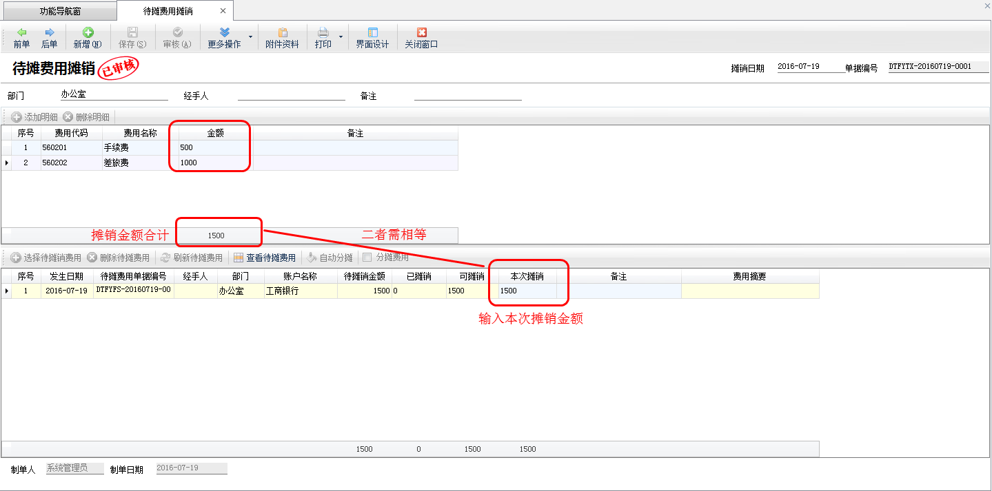 ????點擊“財務處理”—》“待攤費用”—》“待攤費用攤銷”,在“待攤費用攤銷”功能中,在上方錄入攤銷費用名稱及金額,在下方可選擇此前發生的待攤費用,每筆費用會詳細顯示“已攤銷金額”、“可攤銷金額”和“本次攤銷金額”。