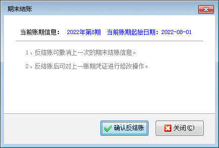 ????反結賬:在工具欄中點擊“反結賬”按鈕,可以對已結賬的賬期進行反結賬。如果當前賬期還沒有執行過期末結賬則會提示無法反結賬。