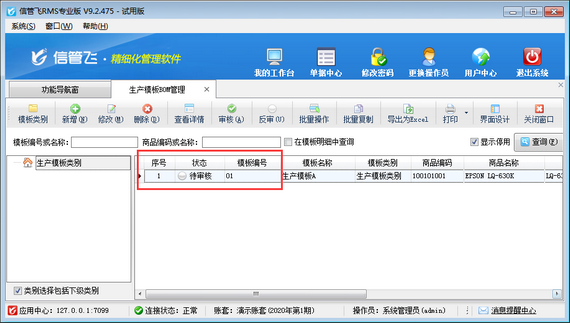 ????反審核成功后,生產模板狀態更新為“待審核”狀態,如下圖所示,即可對這個待審核的生產模板進行修改(刪除)操作。