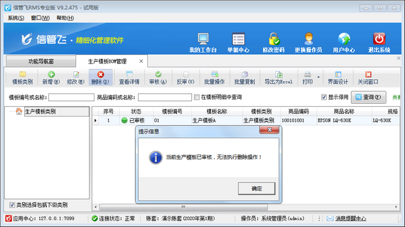 ????生產模板,即BOM清單(物料清單),可配置每生產一個標準單位的產品需要的原材料種類和數量。生產模板已審核后,不允許直接修改或者刪除,如下圖所示。如生產模板數據維護有誤,需要先將已審核的生產模板反審至待審核的狀態,然后在修改(刪除)生產模板即可。