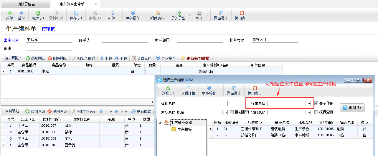 ????之后生產過程中開生產領料出庫單選擇“生產模板BOM表”時,在“選擇生產模板BOM”界面支持根據往來單位查詢選擇生產此商品所需的生產模板。