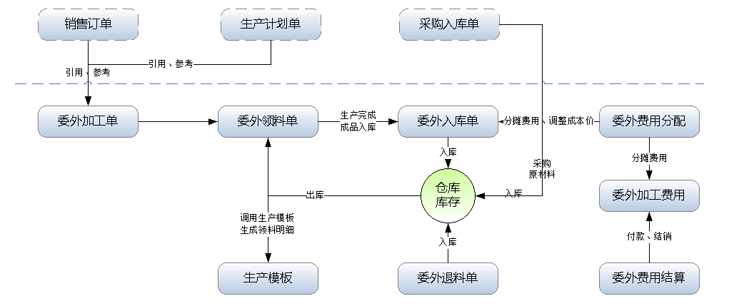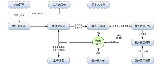 ????實際的企業生產業務中經常會涉及委外代加工業務,有時候需要委托外部工廠幫我們生產一些配件,有時候需要幫忙生成半成品,然后委外生產的成品或半成品,再進入我們車間進行再加工(如包裝封箱、或二次加工等)。專業版及以上版本可以購買 “委外加工管理”擴展功能模塊來管理此業務。