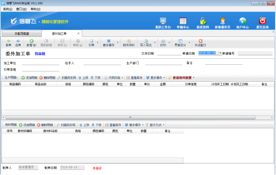 ????(2)當需要加工廠進行加工時,開“委外加工單”錄入加工任務,軟件會根據生產模板自動算出需要的原材料明細。
