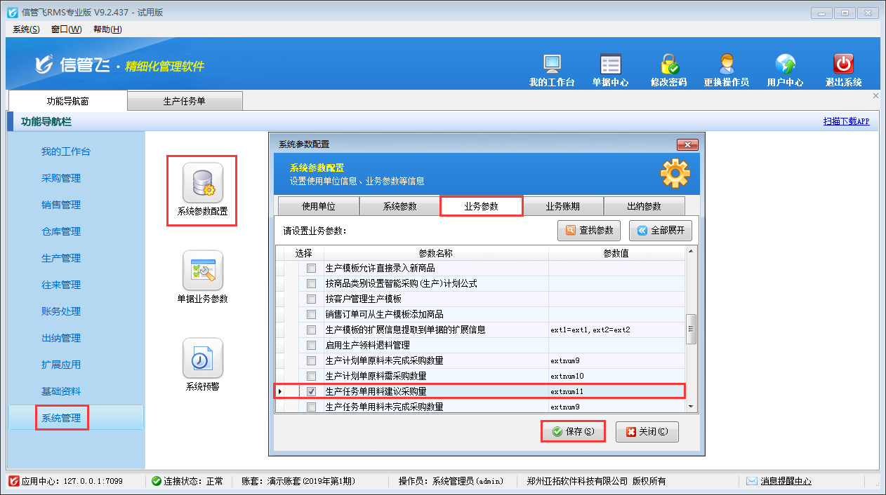 ????在功能導航窗點擊“系統管理”—》“系統參數配置”—》“業務參數”打開業務參數配置界面,然后在生產管理相關參數中打鉤啟用“生產任務單用料建議采購量”參數,并設置參數值,默認為“extnum11(擴展數值11)”,如下圖所示。