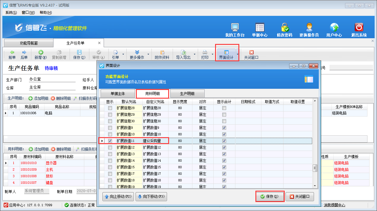 ????參數配置完成之后,打開生產任務單,在“界面設計”—》“用料明細”中將“擴展數值11”自定義列名為“建議采購量”,并勾選顯示出來,如下圖所示。