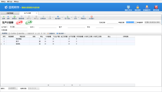 ????生產管理功能是亞拓管理軟件標準版及以上版本可以購買的擴展功能模塊,可適應中小制造企業(工廠)生產業務管理需要。軟件通過業務單據為主線,將生產業務的核心流程有效進行串聯,可有效的管理生產任務下單、生產原材料出入庫、成本核算等業務。生產管理包括了生產計劃單、生產任務單、生產領料出庫單、生產成品入庫單、生產退料入庫單、費用分配單、智能生產計劃、生產模板。下面我們介紹一下生產任務單的使用方法。