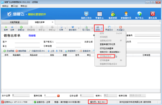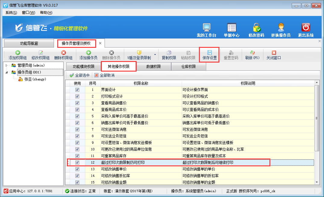 亞拓軟件自主研發(fā)的信管飛RMS、信管飛送貨單軟件、信管飛票據(jù)打印軟件、信管飛倉(cāng)庫(kù)管理軟件都支持自定義設(shè)計(jì)打印模板,打印模板設(shè)計(jì)完成后,為了避免操作員修改錯(cuò)打印模板,軟件可以設(shè)置操作員的打印模板設(shè)計(jì)權(quán)限。(系統(tǒng)管理員默認(rèn)具有所有權(quán)限,不允許修改)。 以信管飛倉(cāng)庫(kù)管理軟件為例,介紹一下如何控制操作員的打印模板設(shè)計(jì)權(quán)限。在功能導(dǎo)航窗,選擇“系統(tǒng)管理”—》“操作員及授權(quán)”,選擇操作員“張三”,然后在“其他操作權(quán)限”中把“打印格式設(shè)計(jì)”權(quán)限前的勾選符號(hào)取消,然后點(diǎn)擊“保存設(shè)置”,如下圖1所示:圖1