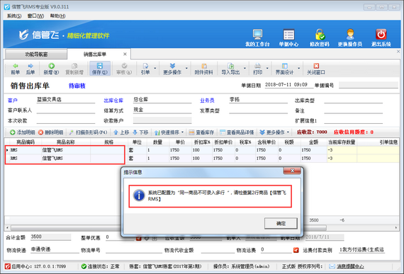 信管飛送貨單軟件、信管飛倉庫管理軟件、信管飛RMS等軟件在新開業務單據時默認在一個單據單據明細內支持同一商品可添加多條記錄(如下圖一所示),部分用戶在開單時需要設置在單據明細中同一商品不可錄入多行?該如何設置呢?本篇文章我們以信管飛RMS為例來介紹一下如何設置開單時單據明細中同一商品不可錄入多行。圖一 銷售出庫單界面 在功能導航窗點擊“系統管理”—》“系統參數配置”—》“業務參數”,即可進入到“業務參數”配置界面,在業務單據明細參數內找到“在單據明細中同一商品可錄入多行”參數,把這個參數的勾選去掉,然后保存,如下圖二所示