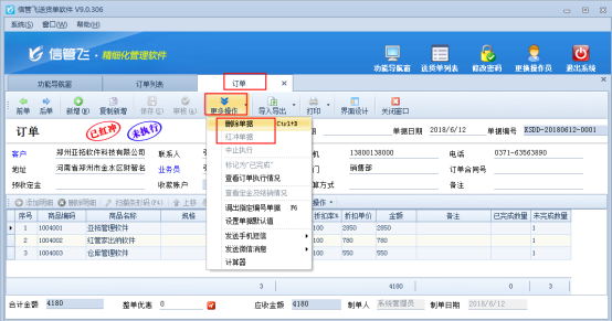 信管飛送貨單軟件、信管飛RMS軟件等支持開銷售單之前先開訂單。銷售單可以引用訂單進行開單。對于剛下訂單出錯或者取消訂單的,軟件支持刪除訂單操作。以信管飛送貨單軟件為例,示范下如何刪除已審核的訂單單據? 訂單保存后可以在訂單列表中進行查看,對于未審核未執行的訂單,可以直接在訂單列表工具欄刪除按鈕進行刪除操作。對于已審核狀態的訂單,點擊訂單列表的刪除按鈕會提示“當前單據不能刪除,(只有處于“待審核”或“已紅沖”狀態的單據才可以刪除)”,如下圖1所示: 圖1