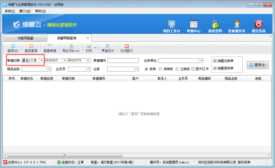 信管飛倉庫管理軟件、信管飛RMS軟件等軟件內都包含統計查詢功能(采購單列表、銷售單列表、采購單明細查詢、銷售單明細查詢等統計查詢報表),軟件內統計查詢報表默認查詢日期是“最近7天”如下圖1所示,如需要修改默認查詢日期,該如何修改呢?下邊以“信管飛倉庫軟件軟件”為例示范如何修改默認查詢日期。 圖1 銷售明細查詢界面 功能導航窗點擊“系統管理”——“系統參數配置”——“系統參數”,在“系統參數”界面可以修改“默認查詢日期”(這里修改為“最近一個月”),修改完成之后點擊“保存”按鈕保存配置。如下圖2所示:&