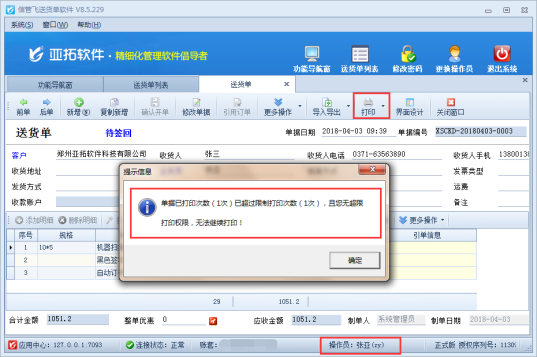 亞拓管理軟件(星光版、標準版、專業版)、信管飛送貨單軟件、信管飛倉庫管理軟件都支持新增操作員進行設置操作員權限。對于業務單據,部分用戶設置操作員及權限時不允許操作員有修改單據的權限。 以送貨單軟件的送貨單單據為例,示范下如何設置操作員不能修改保存后的送貨單的權限。首先在功能導航窗選擇“系統管理”—》操作員及授權,進入操作員管理及授權界面。新增一個操作員“張亞”,選擇操作員張亞后,在右側的功能模塊權限,在業務處理—》新開送貨單權限中取消勾選“反審修改”權限。然后保存權限設置。如下圖1所示: