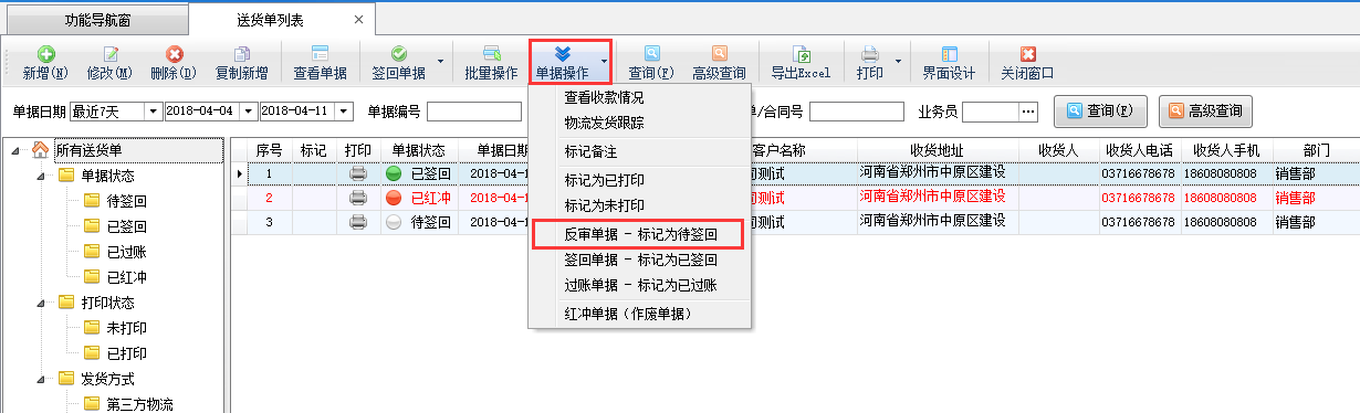 信管飛送貨單軟件通過狀態控制實現簡單的流程管理(待簽回(新開單)-》已簽回(業務員送貨回來或者客戶已簽收快遞)-》已過賬(財務確認已收到貨款)),“已簽回”及“已過賬”的單據無法修改,但是部分情況下可能會需要修改“已簽回/已過賬”的單據,如何修改呢?下面詳細介紹一下操作過程。圖一 “已簽回”及“已過賬”的送貨單單據無法修改,如確需要修改,需要將其標記回“待簽回”狀態,才可以修改成功,在送貨單列表工具欄中點擊“單據操作”—》“反審單據—標記為待簽回”,可以將“已簽回”或者“已過賬”狀態的送貨單單據重新標記為“待簽回”狀態。