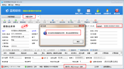 亞拓管理軟件、信管飛送貨單軟件、信管飛倉庫管理軟件等都支持開業務單據。軟件為了區分業務單據,支持開單自動生成單據編號。為了避免操作員登錄軟件修改單據編號,軟件支持在操作員權限中設置不允許操作員修改單據編號。 以亞拓管理軟件專業版為例,示范下如何設置操作員不能修改單據編號的權限。在功能導航窗選擇“系統管理”—》“操作員及授權”進入操作員管理及授權界面。選擇操作員組的操作員“張亞”,點擊右側功能權限設置模塊,點擊“其他操作權限”,在下邊的權限中找到“可修改單據編號”,把勾選“√”符號取消(鼠標單擊即可