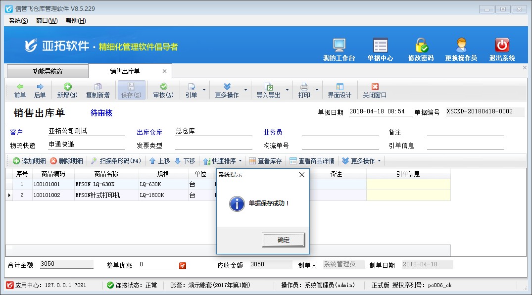 信管飛送貨單軟件、亞拓管理軟件、信管飛倉庫管理軟件等支持開銷售單時輸入業務員以區分單據是誰所開的,也有客戶開單的時候不需要輸入業務員,對于不需要輸入業務員的需求,軟件支持設置系統參數來進行控制業務員是否允許為空。 以信管飛倉庫管理軟件為例,示范下如果設置開銷售單時業務員允許為空。軟件安裝完成,系統參數設置默認業務員不允許為空,正常開銷售單,未在單據主體中輸入“業務員”,商品輸入完成后點擊“保存”按鈕,會提示“業務員不能為空”,如下圖1所示:圖1 在功能導航窗選擇系統管理—》系統參數配置