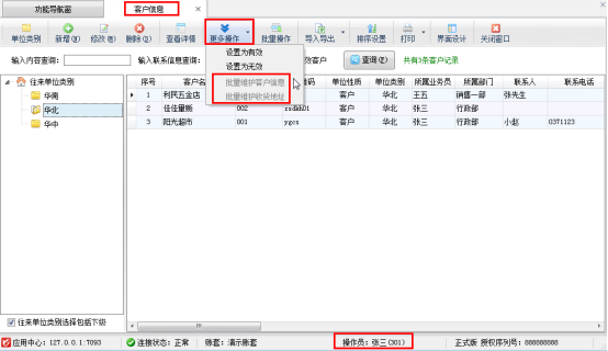 亞拓管理軟件、信管飛送貨單軟件、信管飛倉庫管理軟件等都支持批量維護客戶信息,可批量維護客戶信息的名稱、聯系人、電話、地址等信息。另外軟件中也支持設置操作員不可批量維護客戶信息,本篇文章我們以信管飛送貨單軟件為例詳細介紹一下如何設置操作員不可批量維護客戶信息? 在功能導航窗點“系統管理”—》“操作員及授權”即可進入“操作員管理及授權”界面,選中操作員賬號,在“其他操作權限”界面將“可批量維護客戶信息”權限打鉤取消,然后保存權限設置,如下圖1所示,設置操作員“張三”沒有“可批量維護客戶信息”權限。圖1 操作員管理及授權界面&