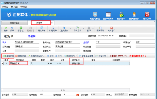 紅管家送貨單軟件、亞拓管理軟件、紅管家倉庫管理軟件都支持管理商品信息,支持開單后直接選擇提前維護好的商品信息資料,有的商品存在商品備注信息,本文章介紹如何在開單的時候選擇商品后把商品信息中的備注信息直接獲取過來。不需再在開單時候再次輸入。 以送貨單軟件為例,示范下如何開單自動獲取商品備注信息。首先需要“基礎資料”—》“商品信息”中把備注信息提前添加好,我們修改一個商品“黑色簽字筆”,修改添加上備注信息,然后保存商品信息。如下圖1所示:圖1 商品備注信息也支持通過