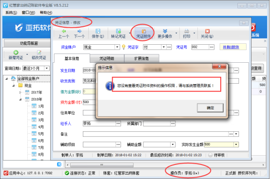 紅管家出納記賬軟件、亞拓管理軟件標準版、專業版支持日記賬導入憑證附件資料,更清晰的管理每筆日記賬的票據詳情信息。為避免每個人都查看到日記賬的詳細開票信息,軟件支持控制操作員的可查看憑證附件資料權限。 以出納記賬軟件專業版本為例,示范下如何控制其他操作員的可查看附件資料權限。在系統管理—》“操作員及授權”—》新增一個操作員“李拓”,選擇該操作員勾選相應的權限,在“其他操作權限”中把權限“可查看附件資料”取消勾選,點擊“保存權限設置”。如下圖1所示:圖1