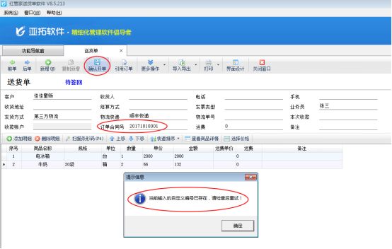 亞拓軟件自主研發(fā)的亞拓管理軟件、紅管家送貨單軟件、紅管家倉庫管理軟件等都支持開單后自動生成單據(jù)編號,另外,軟件也支持錄入自定義編號(不是單據(jù)編號),用戶可以在自定義編號內(nèi)錄入訂單合同號等信息,為了避免錄入的自定義編號出現(xiàn)重復(fù),軟件支持參數(shù)設(shè)置自定義編號不可重復(fù)。 以紅管家送貨單軟件為例,在“系統(tǒng)管理”—》“系統(tǒng)參數(shù)配置”—》“業(yè)務(wù)參數(shù)”內(nèi)將“數(shù)據(jù)可否重復(fù)參數(shù)”中的“自定義單據(jù)編號可重復(fù)”參數(shù)的勾選取消,然后保存設(shè)置。如下圖1所示:圖1 設(shè)置完成后,打開功能導(dǎo)航窗的“業(yè)務(wù)處理”—》“新開