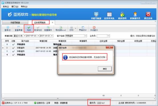 亞拓管理軟件、紅管家送貨單軟件支持管理應(yīng)收賬,對于已結(jié)銷的應(yīng)收款,可以在應(yīng)收款明細表中標記對賬。軟件支持設(shè)置操作員是否具有對賬權(quán)限,以送貨單軟件為例,示范下如何控制操作員的應(yīng)收款對賬權(quán)限。 在功能導(dǎo)航窗,點擊“操作員管理及授權(quán)”,進入操作員管理及授權(quán)頁面,選擇需要設(shè)置的操作員“王亞”(系統(tǒng)管理員默認具有所有權(quán)限,不允許修改),打開“其他操作權(quán)限”,在最后一個權(quán)限“應(yīng)收應(yīng)付款對賬”勾選符號取消,然后保存操作員權(quán)限。如下圖1所示:圖1 保存權(quán)限后,使用操