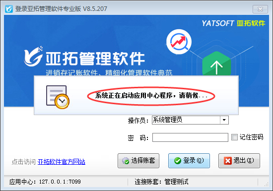 亞拓軟件新架構(gòu)版本安裝完成后會有兩個(gè)圖標(biāo),紅色圖標(biāo)為應(yīng)用中心、藍(lán)色圖標(biāo)為客戶端程序。之前版本使用需要時(shí)需要先打開紅色的應(yīng)用中心然后再打開藍(lán)色的客戶端程序。為了提高用戶使用便捷性,軟件解決這一問題,支持應(yīng)用中心未開啟時(shí)直接登錄客戶端程序系統(tǒng)會自動啟動應(yīng)用中心程序。 以亞拓管理軟件為例示范下,直接打開客戶端程序,會提示“系統(tǒng)正在啟用應(yīng)用中心程序,請稍后...”如下圖所示: 因?yàn)橘~套信息和賬套內(nèi)的操作員信息需要在應(yīng)用中心啟用后才會生效,所以登錄客戶端啟動應(yīng)