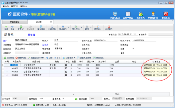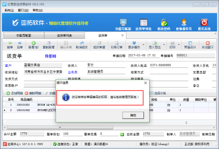 亞拓管理軟件、紅管家倉庫管理軟件及紅管家送貨單軟件開單時單據日期默認是電腦系統的當前日期,部分用戶有時需要補錄以前漏開的單據,就需要進行補單,如何補錄以前的單據呢?本篇文章以紅管家送貨單軟件為例詳細介紹一下送貨單軟件內如何補錄以前的送貨單單據? 登錄軟件,在功能導航窗點“業務處理”→“新開送貨單”即可進入“送貨單”開單界面,單據日期默認顯示的當前日期“2017-04-18”,如圖1所示。圖1 例如,我們需要補錄2017年3月1日的一個單據,可以進行選擇一下單據日期,如圖2所示。圖2&n