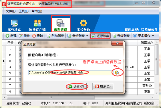 送貨單單機版指一人一臺電腦使用,使用時需要插入加密鎖,鑒于很多客戶有時候需要更換電腦使用,這次介紹下如何更換電腦使用。 送貨單單機版更換電腦需要首先把原來的電腦做好備份工作,備份是在電腦的應用中心(紅色圖標)上進行操作。備份時可以選擇備份的保存路徑,為了更清晰的看到備份數據方便拷貝,可以把備份路徑更改為桌面。具體操作如下圖1所示:圖1 點擊“備份”后,賬套備份數據保存在桌面上,備份數據名字為“測試賬套.dbk”(可自己取名字),把這個賬套備份數據拷貝