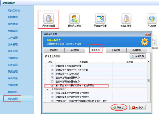 亞拓管理軟件(星光版、標準版、專業版)、紅管家倉庫管理軟件及紅管家送貨單軟件都支持在開單的時候直接輸入商品,軟件默認設置是需要輸入商品后需要Enter鍵確認,如需要不按回車鍵檢索直接輸入需要設置一下軟件的業務參數。 以亞拓管理軟件為例,詳細介紹如何設置開單輸入商品后直接檢索?在導航窗選擇“系統管理”—》“系統參數配置”—》“業務參數”中把“輸入商品名稱(編碼)后回車才能檢索商品”參數勾選保存,如下圖所示: 勾選此參數保存后,新增一個單據,可以直接輸入