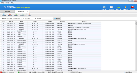 亞拓管理軟件、紅管家送貨單軟件、紅管家出納記賬軟件、紅管家倉庫管理軟件和紅管家票據打印軟件都可以實現多個操作員登錄使用軟件的功能,操作員登錄軟件后,系統會生成操作日志,在系統操作日志管理中可以查看每個操作員的登錄退出記錄以及重要操作的記錄。系統管理員可刪除操作日志,支持批量操作。本文以亞拓管理軟件專業版為例詳細介紹一下軟件中查看系統操作日志的使用方法。 在功能導航窗點“系統管理”—》“系統操作日志”即可進入“系統操作日志”界面,如圖1所示。圖1 系統操作日志界面 如圖1所示,可以根據操