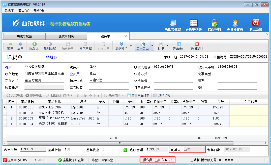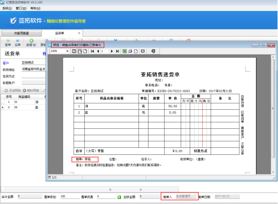 紅管家送貨單軟件、亞拓管理軟件、紅管家倉庫管理軟件都支持開單打印送貨單(銷售單),打印模板中的制單人,默認是當前登錄軟件的操作員,有的客戶需要打印模板統一為一個制單人,就需要在打印模板中固定制單人名字。 以送貨單軟件為例,示范如何在打印模板中直接固定制單人名字,選擇一個送貨單單據,選擇“打印”—》“打印格式設計”—》“設計格式”進入打印模板設計器頁面,如下圖1、圖2所示:圖1圖2 在設計器上,選擇“制單人”文本框,雙擊打開,輸入制單人的名字,點擊“√