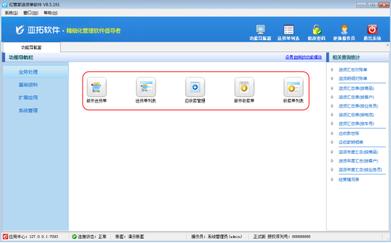 紅管家送貨單打印軟件是一款針對中小型企業開發的集送貨管理(發貨管理)、退貨管理(銷售退貨)、銷售收款(應收款管理)等功能為一體的送貨管理及打印軟件(送貨單打印軟件、發貨單打印軟件、出貨單打印軟件、收據打印軟件、貨單票據打印軟件)。 軟件界面默認顯示全部的功能模塊,主要包括新開送貨單、送貨單列表、應收款管理、新開收款單、收款單列表、新開退貨單、退貨單列表、新開訂單、訂單列表。軟件支持設置啟用的功能模塊,方便用戶根據自己的業務需求自定義顯示用的到功能模塊或隱藏用不到的功能模塊。下面我們介紹一下在紅管家送貨單軟件中設置啟用的功