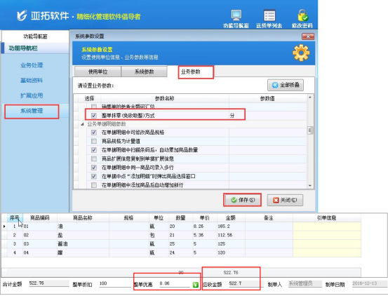 在銷售和采購的過程中,會出現價格優惠的情況,亞拓軟件的紅管家送貨單軟件和亞拓管理軟件支持兩種優惠方式:打折優惠、抹零取整。以抹零取整優惠為示范,來展示下在軟件中如何設置抹零取整的默認抹零單位,抹零取整有三種方式:元、角、分,軟件默認選擇的價格參數是取整到“角”,我們以紅管家送貨單軟件為例,示范如何修改抹零取整的默認抹零單位。 在左側的導航窗選擇“系統管理”—》“系統參數配置”的業務參數,勾選上“整單抹零方式”,參數值默認為“角”,可在后邊的下拉框修改參數值。如下圖1所示:圖 1 &nbs